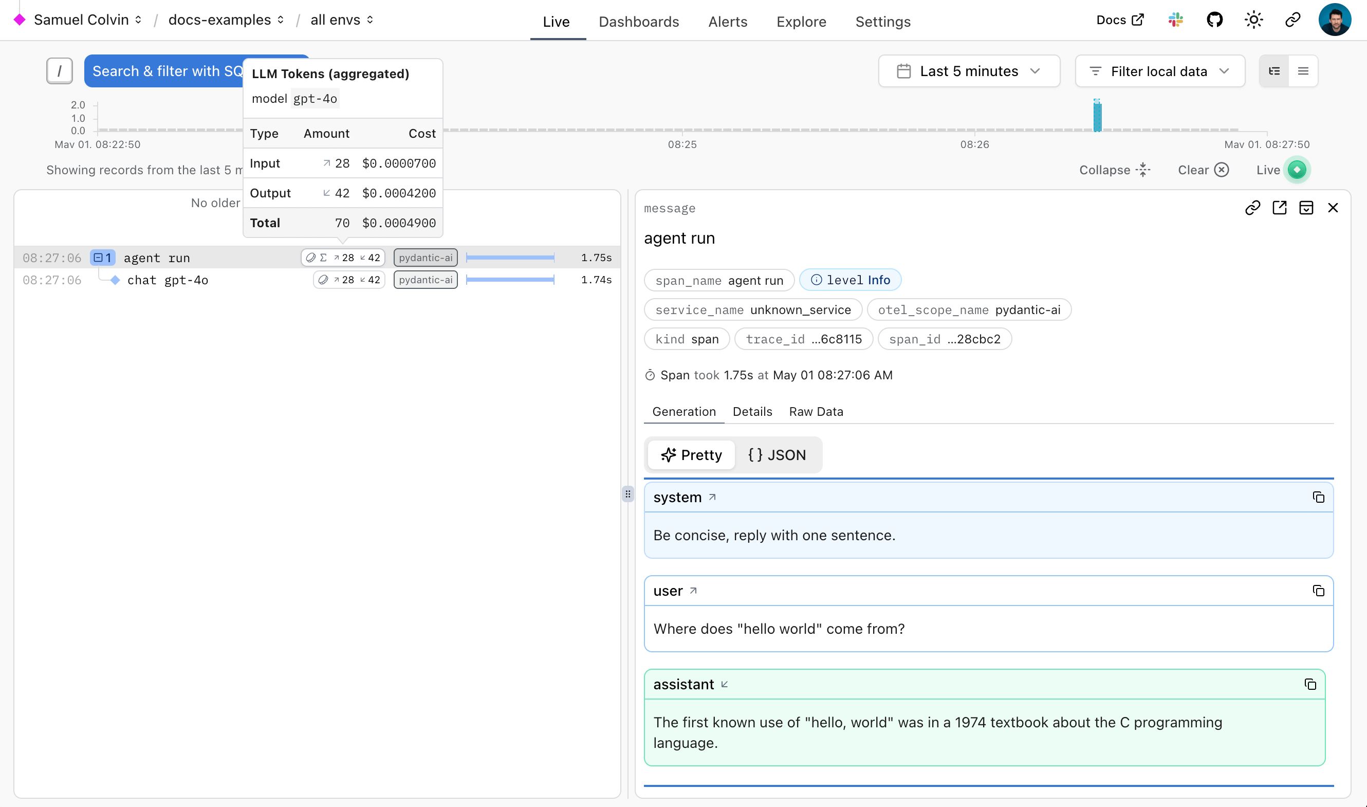 logfire.configure()configures the SDK, by default it will find the write token from the.logfiredirectory, but you can also pass a token directly.logfire.instrument_pydantic_ai()enables instrumentation of Pydantic AI.- Since we've enabled instrumentation, a trace will be generated for each run, with spans emitted for models calls and tool function execution